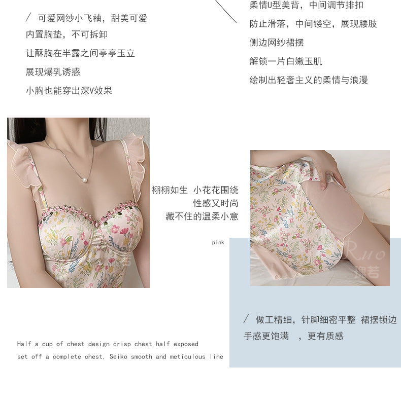 DZ Magnificent Pure Desire Smooth Satin Lingerie Deep V Sexy Mesh Nightdress Set with Chest Pads and Flutter Sleeves in Plus Size A5118