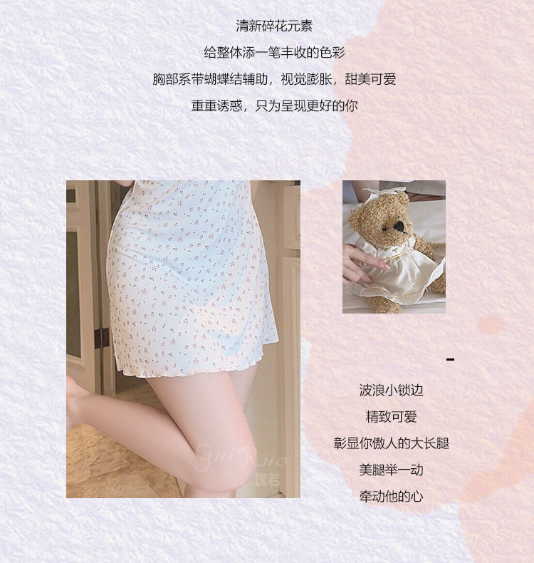 DZ Rose-like Deep V Push-Up Padded Bra Pure Desire Temptation Slim Sexy Printed Nightdress Plus Size Set5841