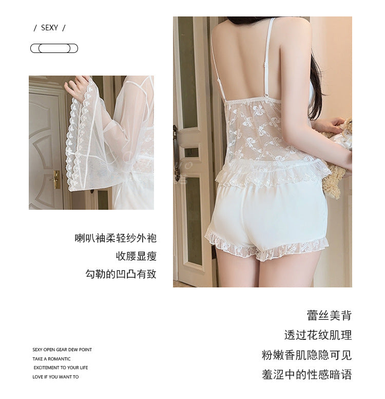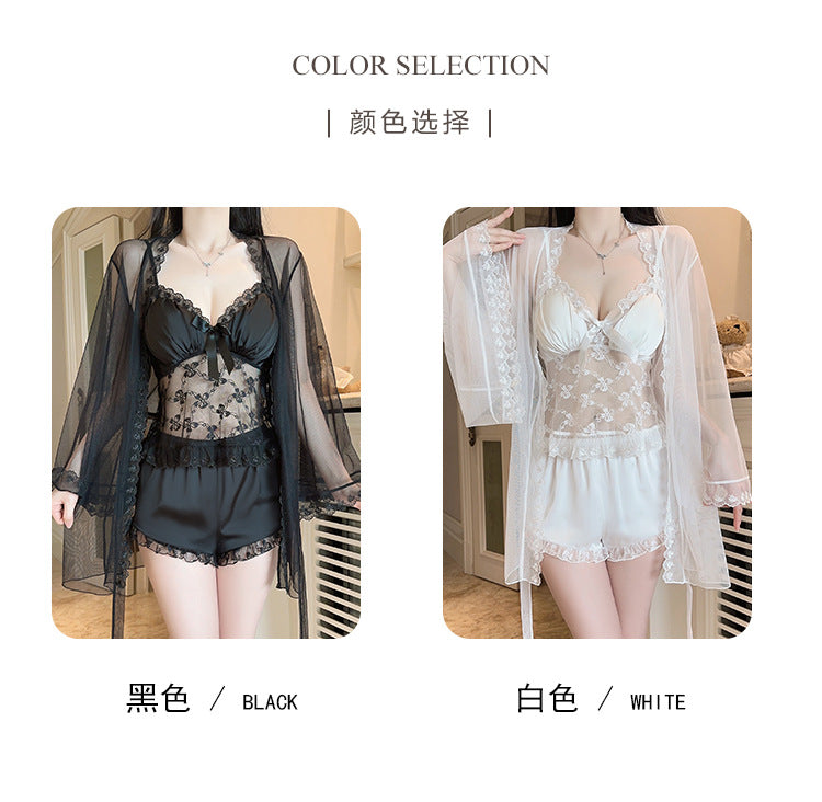 DZ Gorgeous Sweet Smooth Satin Lingerie Passionate Hot See-through Lace Padded Bra Top Three-piece Set5083